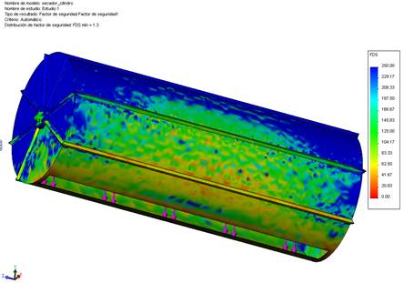 Se realizó un análisis de esfuerzos y deformaciones del fermentador para evaluar su resistencia de las cargas antes de su construcción. La simulación por el método de los elementos finitos se llevó a cabo con el software Solidworks. En la Figura 1 se muestra la distribución del factor de seguridad en el fermentador.