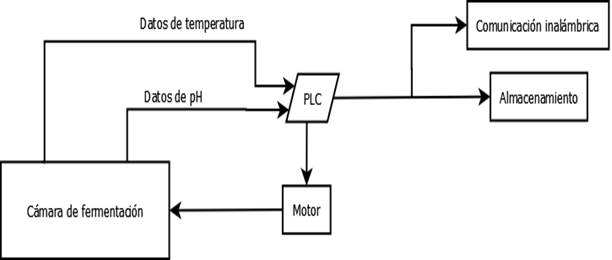 El sistema automatizado para control de un fermentador de cacao consta de seis sensores (tres de temperatura y tres de pH), una unidad de control (PLC – Programador Lógico Computacional), un motor para el giro del cilindro fermentador y un sistema de respaldo de energía eléctrica.