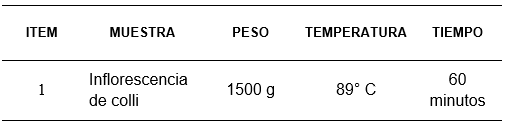 Para la extracción se utilizó el método de la infusión en un medio acuoso a una relación de baño 1/4(1 g de material: 4 ml de agua), las condiciones de temperatura y tiempo se muestran en la tabla 1, el volumen alcanzado fue de 6500 ml. Finalmente, el colorante se recolectó en frascos y fue almacenado en ausencia de luz hasta su posterior uso.