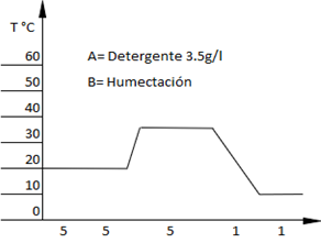 El proceso de pretratamiento de fibra de alpaca se trabajó a una relación de baño 1:30 (1 gramo de fibra: 30 ml de agua), el detergente / humectante utilizado fue Invadina lun, a una concentración de 3.5 g/l y el tiempo de pretratamiento de los hilos de fibra de alpaca es de 17 minutos a una temperatura de 35 ° C. El proceso se realizó, según la curva de pretratamiento, mostrada en la (Figura 1).
