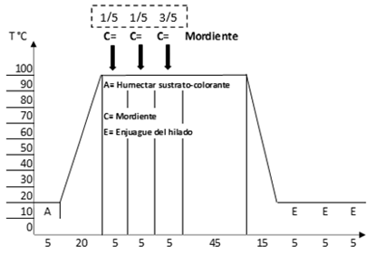 El teñido empieza con la humectación del colorante y el hilado de alpaca, después se eleva a una temperatura determinada, posterior a ello, se adiciona el mordiente crémor de tártaro en tres etapas: 1/5, 1/5 y 3/5; el sustrato con el colorante debe cumplir el tiempo establecido para cada prueba. Finalmente, el hilado teñido se enjuaga tres veces hasta obtener un agua cristalina y se procede a secar el sustrato teñido. El proceso de tintura se llevó a cabo según la Figura 2.