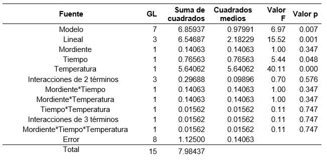De acuerdo a un análisis de regresión factorial general, encontramos que el modelo tiene un p-valor de 0.007, lo cual es posible concluir que el colorante natural inflorescencia de colli (buddleja Coriacea) tiene efectos significativos en la solidez de color a la luz solar de teñido de fibras de alpaca (Figura 3).