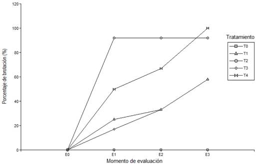 Porcentaje de brotación para cada tratamiento respecto al momento de evaluación