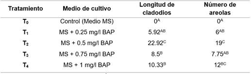 El empleo de BAP en los medios de cultivo in vitro ha permitido la proliferación de cladodios, siendo la más eficiente de las citoquininas, puesto que permite la división celular y modifica la dominancia apical (Bhojwani & Dantu, 2013), a pesar de ello existen aún pocos estudios que empleen BAP para la propagación in vitro a partir de areolas de pitahaya, sobre todo para variedades como H. guatemalensis, además las concentraciones bajas empleadas permitieron explantes libres de tejido calloso por lo que la carga genética de la planta donadora se mantendría sin variación alguna concordando con lo reportado por Viñas et al. (2012) que optó por reducir sustancialmente dichas concentraciones.