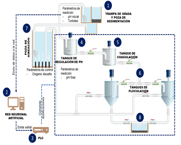 One of the main problems that concerns companies dedicated to leather tanning and dressing lies in the high contaminant concentrations of the effluent that they release into the sewage network, which exceed the maximum admissible values (VMA) established in DS 010-2019 -VIVIENDA.In line with this reality, an alternative is presented to reduce the contaminant load of Biochemical Oxygen Demand (BOD5), Chemical Oxygen Demand (COD) and Total Suspended Solids (TSS) present in tannery waters through the use of a effluent treatment system that is controlled by an artificial neural network that automatically determines the dosing of inputs for the treatment of effluents in tanneries and depending on the combination of effluents from the tannery processes, the chemical inputs are dosed.The methodology used consists of removal of sedimentable organic load through a grease trap and sedimentation pond, oxidation of sulfur organic matter, pH regulation, coagulation and flocculation according to the dosage indicated in the neural network and an aeration system. With a sample of 5 m3 / day, it was possible to reduce the parameters by 70%, obtaining a concentration of BOD5, COD and TSS around 211.3 O2 mg / L, 790 mg / L and 109.7 mg / L respectively; meanwhile, 0.007 mg / L of hexavalent chromium, 0.005 mg / L of total cyanide, 1.9 mg / L of settleable solids, 6.5 mg / L of oils and fats and 740.9 mg / L of sulfates were obtained; all under the validated treatment system unlike conventional methodologies that only treat the effluents for each process separately.