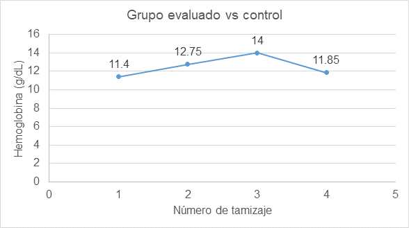 Se puede observar en la figura 1, la evolución del incremento de la hemoglobina en los niños y niñas que consumieron el producto una vez por día, iniciamos con un valor promedio de 11.40 ± 0.54 Hb y transcurrido un mes se logró incrementar hasta 12.75 ± 0.95 Hb lo que demuestra un comportamiento ascendente de la curva en el tiempo, y finalmente para el mes 02 llegando a un 14.00 ± 0.81Hb en promedio que comparado con nuestro grupo control que no consumieron el producto y sus niveles de Hb se mantuvieron en el tiempo con un valor de 11.85 ± 0.32 Hb, notamos una diferencia de 2.15 ± 0.49 Hb respecto del mes 02, lo que nos indica que al consumir el producto (p < 0.05) ayudó a incrementar los niveles de Hb y reducir la anemia en los niños y niñas que participaron de este estudio.