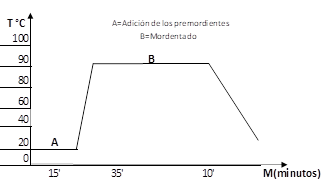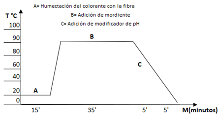 Se utilizó el premordentado con 21% de alumbre y 12% de Bitartrato de potasio en una relación de baño 1/10. Según la curva de pretratamientos que se presenta en la Figura 3, en el Punto A se adiciona la solución con las madejas de hilado de 5.5 g, en el punto B se eleva la temperatura a ebullición por un tiempo de 60 minutos, después se realiza el enjuague, escurrido y secado en lugares de cerrados de preferencia. Este proceso prepara el hilado de alpaca para que el pigmento se adhiera de mejor manera en la estructura de la fibra.