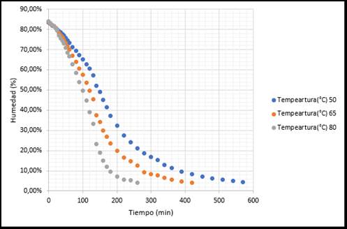 Podemos observar en la Figura 1 que al incrementarse la temperatura se presenta una mayor pérdida de humedad en menos tiempo, por lo que se concluye que la mayor temperatura de aire implica mayor velocidad de secado.