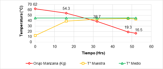 El orujo inició el proceso con 62 Kg., a una temperatura promedio de 12.2°C, con el que se obtuvo 16.5 Kg de orujo deshidratado a una temperatura constante de 45°C. A partir de las 18 horas del proceso, las muestras de orujo mostraron un rápido descenso en peso, debido a que las muestras de orujo, alcanzaron una temperatura aproximada de 40°C., hasta las 48 horas en donde alcanzaron un equilibrio térmico con el medio.