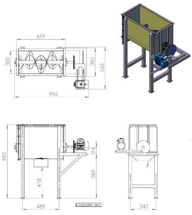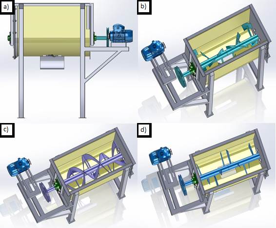 En la Figura 1 se muestran los modelos de paletas a utilizar. En la parte a) se muestra la vista lateral del prototipo, en la parte b) se muestran las aspas en forma de martillo, en la parte c) se tienen las aspas helicoidales y en el d) las aspas rectas. En cada uno de estos modelos se midió el torque necesario en función de los kilogramos de panela a mezclar, esto junto a los esfuerzos que se generaban en las aspas. También se midió el aumento de temperatura durante 5 min de mezclado a mitad de la capacidad del prototipo. En la Figura 2 se muestran las medidas generales del prototipo utilizado para las pruebas. El motor es de un caballo de potencia y una velocidad final en el eje de 19.8 RPM.