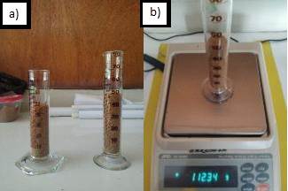 Determinación de la densidad aparente de la panela: a) Medida en probeta, b) Pesado