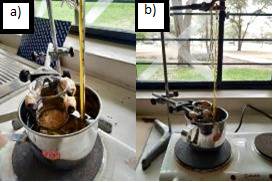 En la primera prueba se utilizó un baño de aceite, un vaso graduado, un termómetro, un soporte universal y una hornilla eléctrica. El procedimiento realizado fue el siguiente: Se montó un recipiente metálico lleno de aceite vegetal y fue colocado sobre una hornilla. El aceite permitió un calentamiento gradual y uniforme. Por medio del soporte universal se colocó el vaso graduado que contenía la muestra de panela, y se posicionó de tal forma que el aceite lo pueda calentar, al mismo tiempo se colocó el termómetro al interior del baño de aceite para controlar la temperatura. El equipo quedó tal y como se muestra en la Figura 10.
