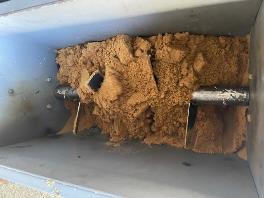 El prototipo con aspas helicoidales como el mostrado en la Figura 19 presentó un consumo de corriente de 1.04 A con cuatro tazones, 1.2 A con cinco tazones, 1.47 A con seis tazones y 1.76 A con siete tazones. En este momento igual que el modelo anterior se frenaba en la parte superior cuando la panela granulada se comprimía, pero el frenado era menor que el caso anterior. Lo que supone un consumo de 493W para los 1.76 amperios, pero con dos tazones más que el modelo anterior de paletas.
