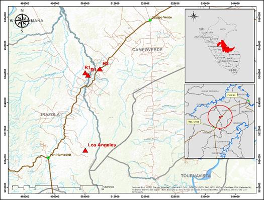 Las coordenadas UTM de los 4 sitios de estudio donde se colectaron las muestras fueron: Los Ángeles coordenada 504079E,9026550N, R2 coordenadas 507957E,9049432N, R1 con coordenadas 504047E,9048324N y R1 con coordenadas 504800E,9047646N.