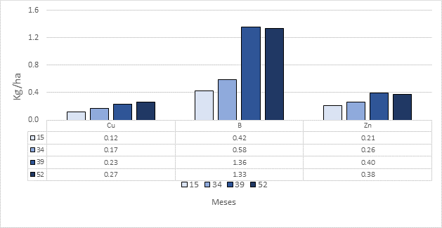 Del gráfico 1, se observa que el microelemento de mayor extracción es el Boro y este se incrementa conforme aumenta la edad de la plantación. Esto se corrobora por Ferrando (2010), donde indica que en plantaciones de Eucalyptus sp., el Boro es el microelemento requerido en mayor cantidad y que frecuentemente se presenta en niveles muy deficientes en el suelo, siendo este una limitante para crecimiento de la fase juvenil. El cobre y el zinc también se encuentran en cantidades similares aumentando conforme a la edad, pero en menor proporción al boro.
