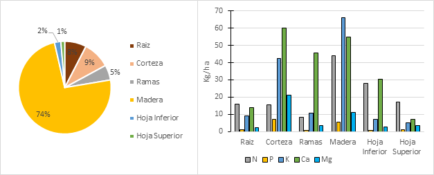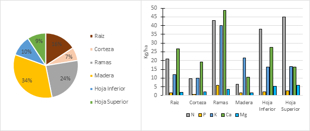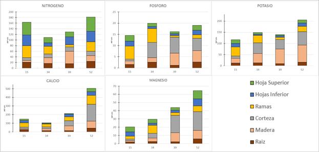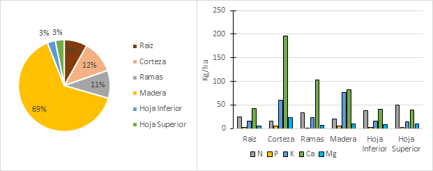 También se observa que la mayor presencia de N a los 15 meses de edad se presenta en las hojas, seguido de las ramas y en mucho menor proporción en la madera; siendo incluso este último, el tejido vegetal de mayor porcentaje en biomasa (34%) presente en el árbol; sin embargo, el potasio es el elemento de mayor concentración en la madera frente a otros elementos (Ca, N, Mg y P) para la edad de 15 meses. Por otro lado, el calcio se encuentra en los mayores niveles de concentración en ramas, raíz y corteza, mientras que los elementos de menor concentración a una edad temprana son el magnesio y el fosforo.
