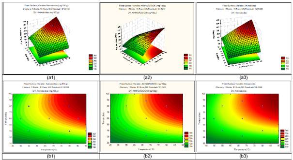 En la Figura 3, se observa que las temperaturas y tiempos empleadas incrementan significativamente la concentración de Aminoácidos de 141.46 a 307.69, de 137.79 a 300.24 y de 138.54 a 286.64 mg/100g en ajos negros de variedades Napuri, Barranquino y Chino, respectivamente, siendo los tratamientos 4 y 6 (Tabla 4), los que presentaron las más altas concentraciones de Aminoácidos en las tres variedades, los cuales se obtuvieron a condiciones de temperatura de 80 y 85.2°C y tiempos de 80 y 60 días respectivamente, concordando así con la gráfica de superficie de respuesta y contornos, en donde la región roja representa diversas combinaciones de temperaturas y tiempos para una máxima concentración de Aminoácidos.