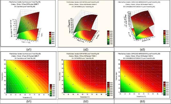 contornos (b1,b2,b3); Contenido de Capacidad antioxidante vs Temperatura y