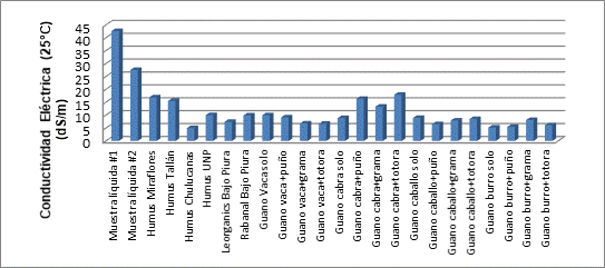 Las demás muestras correspondientes a los productores de humus de las restantes zonas de la provincia de Piura arrojaron valores inferiores a 17,00 dS/m., valores muy por debajo de las Muestras Líquidas #1 y #2. Es preciso señalar que los humus de Chulucanas, UNP, LEORGANICS y Rabanal muestren valores menores a 10 dS/m.