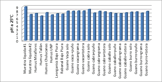En el caso de las mezclas experimentadas, se muestra que casi todas tienen un nivel de pH ligeramente alcalino entre 7.10 y 7.80, lo cual es muy importante para su uso. Aquí el estiércol de caprino con puño, al igual que el de caballo con puño y caballo con grama ofrecen la mejor opción por poseer un pH cercano a la neutralidad, ideal para la actividad microbiana (Guzmán 2009), mientras que el caprino puro es muy alcalino.