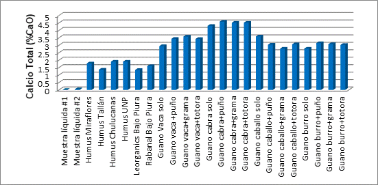 Para el caso de las mezclas ensayadas en este trabajo, todas alcanzan niveles de Calcio total que oscilan en un rango entre 2.77 y 4.58 %, superior a los obtenidos por los humus ofrecidos en la región. Las mezclas de estiércol de caprino con puño, grama y totora presentaron los niveles más altos, con 4.58%, 4.51% y 4.51%, respectivamente, y que se encuentran dentro del rango entre 2-8% de Calcio total (INFOAGRO, 2012)