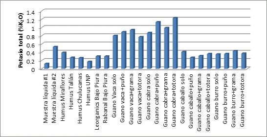 De las mezclas en estudio, podemos afirmar que el estiércol de caprino con puño, grama y totora alcanzan los niveles más altos de Potasio total, 1.13%, 0.99% y 1.23% respectivamente, coincidiendo con otros estudios (Ortega, 2014 y Chávez et al, 2017).