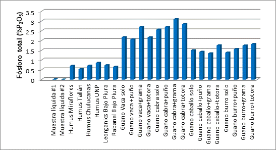 Además, se observa que todas las mezclas del experimento tienen un contenido superior de Fósforo total que las muestras ofrecidas en la región. Las mezclas de estiércol de caprino con puño, grama o totora seguidas por las mezclas de estiércol de vacuno con puño, grama o totora alcanzaron los niveles más altos en rangos entre 3.09% y 2.06% de Fósforo total, lo que evidencia que son valores superiores a los obtenidos por otros estudios (Mulet et. al., 2008) que solo alcanza 1.2% y se considera dentro del rango admisible para el crecimiento y desarrollo de los cultivos.