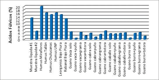 Humus Tallan, reporta un valor cercano al 3% y le siguen Humus UNP, LEORGANICS y Chulucanas, con valores por encima del 1.6% en los abonos comerciales de la zona, Figura 11. En cambio, todas las mezclas experimentales superan en su concentración de ácidos húmicos a las muestras ofrecidas en la región. Las mezclas de estiércol de vacuno con puño, caprino con puño y burro con puño presentan los valores más altos de ácidos húmicos, entre 11-13%, superiores a los encontrados por Ortega (2014) de 5.1%.