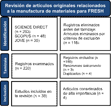 Se realizó una búsqueda sistemática con el objetivo de contestar a la pregunta ‘¿Cuáles son los requerimientos de calidad en la manufactura de estructuras bioimpresas en baños de soporte?’ Para ello, se revisaron dos bases de datos (SCOPUS, ScienceDirect) y todos los artículos con videos del Journal of Visualized Experiments (JoVE) empleando los términos de búsqueda: TITLE−ABS−KEY (bioprinting AND (FRESH or Bath support)).