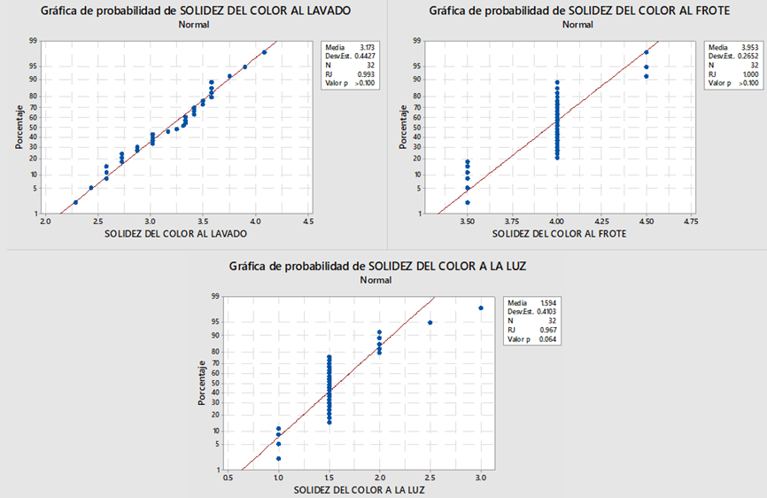 En la tabla 1, se observa la matriz de experimentos con un dise o factorial de 2^4 y dos r plicas, considerando como variables respuesta la solidez del color al lavado, al frote en seco y a la luz. La base de datos para el an lisis estad stico consiste en los grados de solidez del color, los cuales est n en un rango de 1 a 5, donde el grado m s alto de buena solidez del color es 5, y el grado 1 indica un alto grado de migraci n de color.