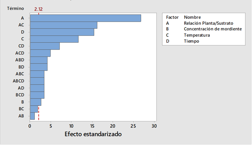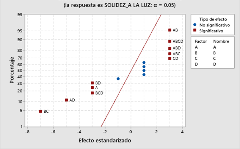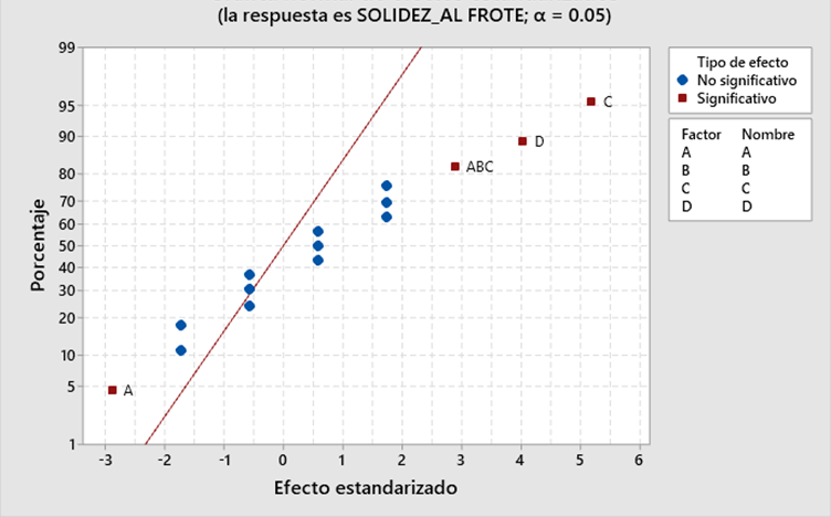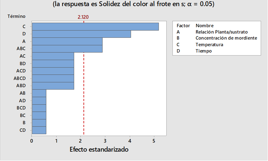 La Figura 5 y 6 contrastan los resultados de la Tabla 3, donde se verifica que el factor relaci n planta/sustrato (A) y tiempo (D) son significativos. Del mismo modo, el factor temperatura (C) y la interacci n de tres factores ABC tienen un mayor efecto en la solidez del color al frote en seco.