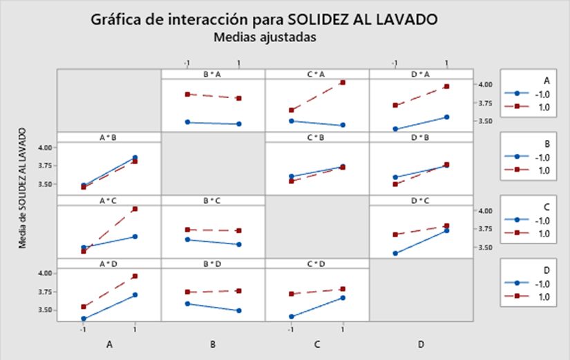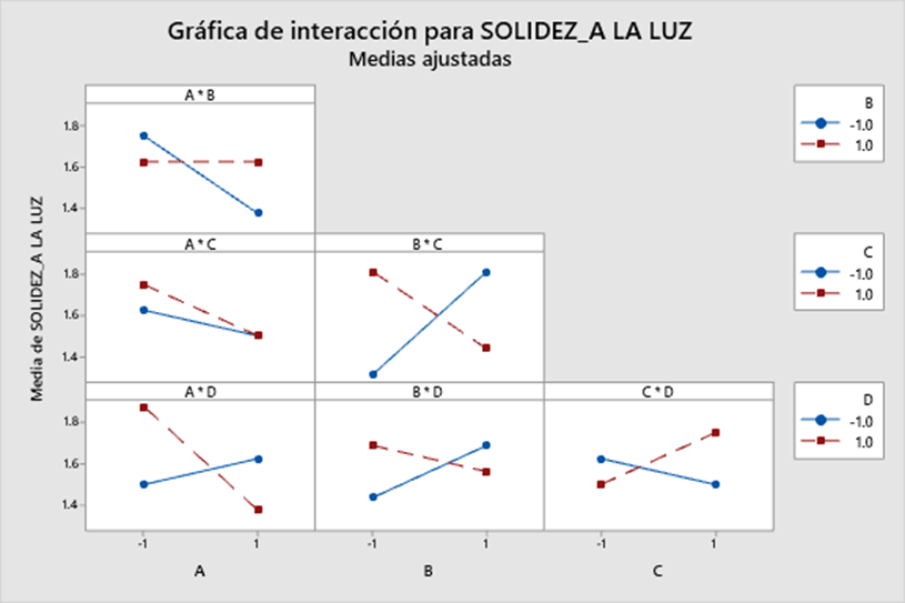 En la Figura 10 se observa la interacci n de los efectos, resaltando que las l neas se cruzan en los efectos AB, AD, BC, BD y CD, lo cual indica que existe un efecto del te ido con la semilla de achiote sobre la solidez del color a la luz, con excepci n del efecto AC, como se puede verificar en las gr ficas anteriores.