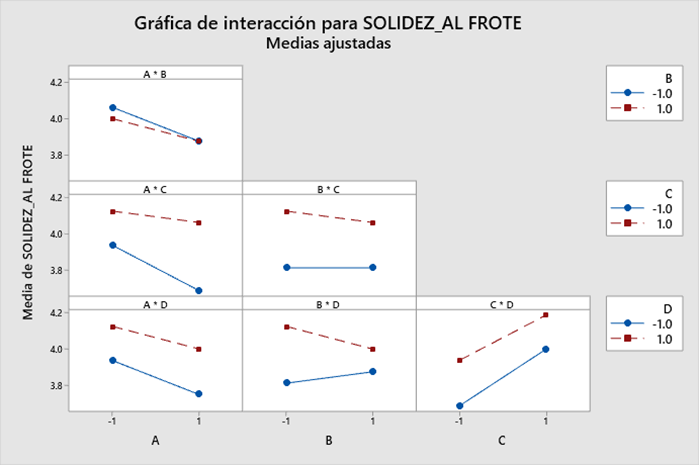 En la Figura 7 se observa la interacci n de los factores, y se puede ver que las rectas que definen el efecto en la solidez del color al frote son pr cticamente paralelas, a excepci n del factor AB, lo cual indica que existe una interacci n ligera; sin embargo, todas las interacciones de dos factores no son significativas, como se puede observar en los resultados del ANOVA de la Tabla 3.