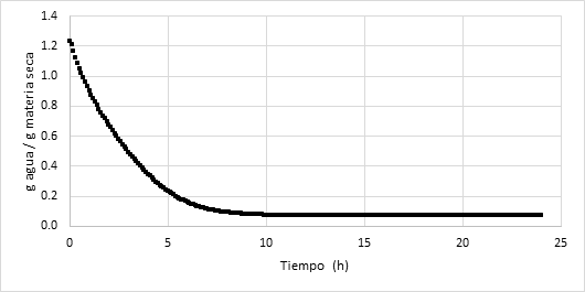 La broza de café recolectada fue llevada a la sede de Universidad Nacional de Trujillo (Ubicación Trujillo). Al llegar al laboratorio, se le realizó una prueba de contenido de humedad, a partir de la cual se determinó que este era de 58,76 % en base húmeda (bh) para ello se usó el determinador halógeno de humedad (A&D Company, modelo MX-50). Después de agregar la solución estéril de NaOh 1.0M al 3% (p/v) en 100 g de café se obtuvo broza de café libre de lignina al 28.81%. El secado se realizó en una estufa Memmert (Modelo: UF55PLUS). Hasta obtener una humedad constante entre 6 – 7 %(base húmeda) a 40°C durante 24 horas según lo reportado en (Cerda et al 2017). Como se observa en la figura 2, se muestra los resultados obtenidos de la pérdida de agua por cada gramo de materia seca en el proceso de secado, hasta obtener humedad constante (6.81% en base húmeda).