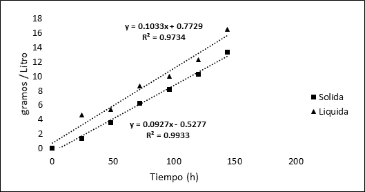 En la figura 3, la concentración en el tiempo de la fermentación sólida y la fermentación liquida en el tiempo, como se puede apreciar presenta un ajuste de R2=0.9734 para la fase liquida y un ajuste de R2= 0.9933 pata la fermentación sólida. En este proyecto la SSF la producción fue mayor a la fermentación sumergida, es probable que la toma de muestra realzada cada día tenga efecto en la biomasa que podría retrasar las estabilización del sistema, que comparado con (Kuhad, et al., 2016). La fermentación en estado sólido (SSF) ofrece ventajas importantes sobre la fermentación sumergida común como lo es la reducción de la energía reducida, alto rendimiento y una disminución de efectos inhibidores en el proceso de la producción enzimática.