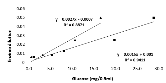 A partir de la figura 3, calculamos los valores de FPU/ml (unidades de papel filtro) para la fermentación sólida determinando un valor de 92,500 FPU/ml (mililitro de solución de enzima original sin diluir), mientras que para fomentación liquida se obtuvo un valor de 78,7234 FPU/ml (mililitro de solución de enzima original sin diluir). De acuerdo con los estudios realizados por (Cerda, et al., 2017) quien desarrolló la operación de lote secuencial para la producción del inóculo especializado (9 ± 1 FPU/ ml) estos datos obtenidos son mucho mayores a los reportados por el autor lo que demuestra que se puede realizar una FSS optima en la producción de celulasa usando una mezcla inóculo sin comprometer la productividad.