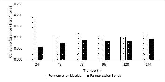 Consumo desde el tiempo cero hasta el tiempo 144 horas de la fermentación sólida y liquida.